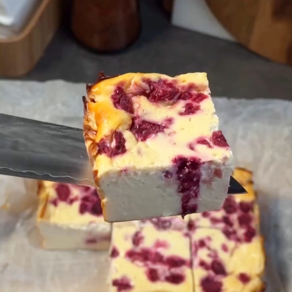 A creamy, high-protein cheesecake made with cottage cheese, Greek yogurt, and raspberries. Naturally sweetened and packed with 13g protein per slice.